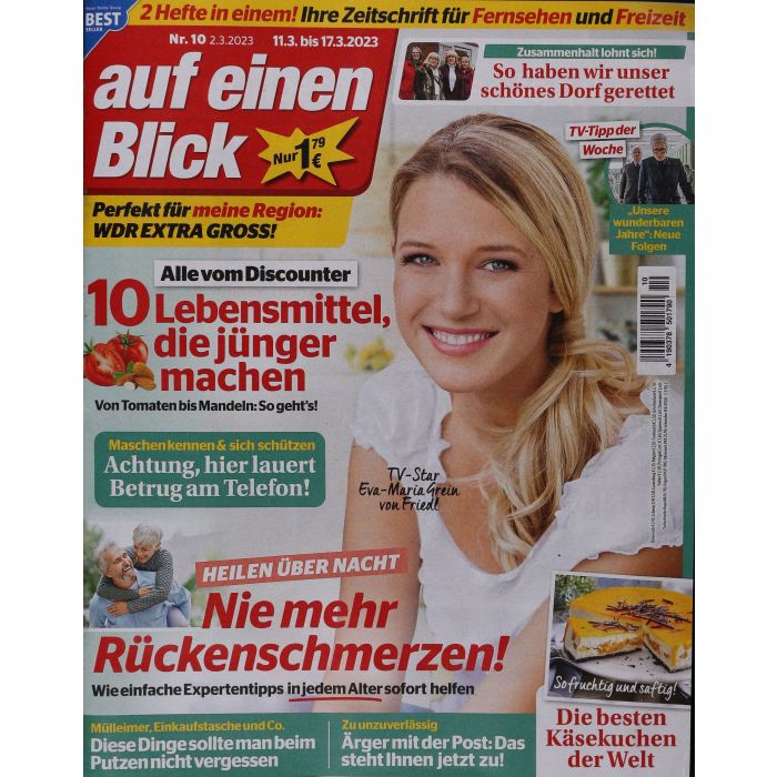 Die Auf einen Blick ist eine wöchentlich erscheinende Programmzeitschrift, die neben einem umfangreichen Programmüberblick aller größeren Fernsehsender, auch zahlreiche Reportagen rund um Prominente sowie Tipps und Tricks für das Alltagsleben bietet. Die Zeitschrift orientiert sich an den Interessensgebieten von Frauen der mittleren Generation und bietet praktische Einblicke und Informationen rund um Themen wie Kinder, Reisen, Beruf und Gesundheit.