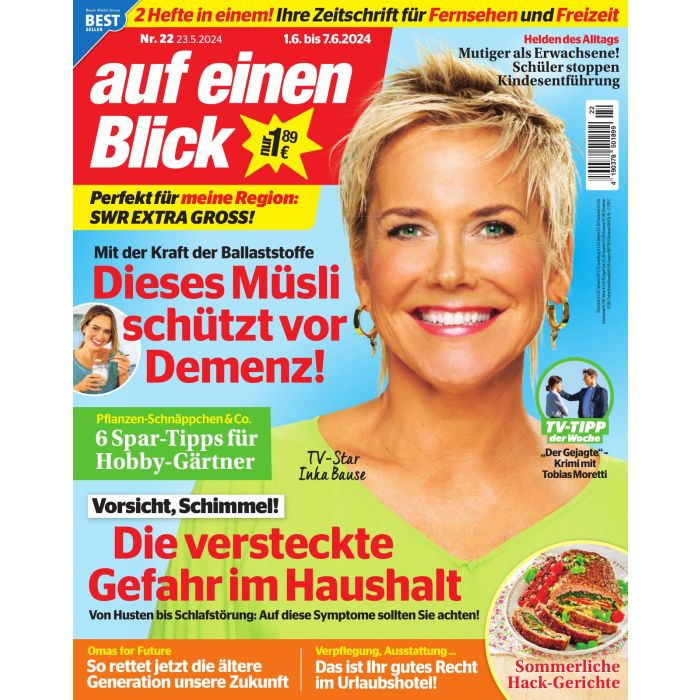 Die Auf einen Blick ist eine wöchentlich erscheinende Programmzeitschrift, die neben einem umfangreichen Programmüberblick aller größeren Fernsehsender, auch zahlreiche Reportagen rund um Prominente sowie Tipps und Tricks für das Alltagsleben bietet. Die Zeitschrift orientiert sich an den Interessensgebieten von Frauen der mittleren Generation und bietet praktische Einblicke und Informationen rund um Themen wie Kinder, Reisen, Beruf und Gesundheit.