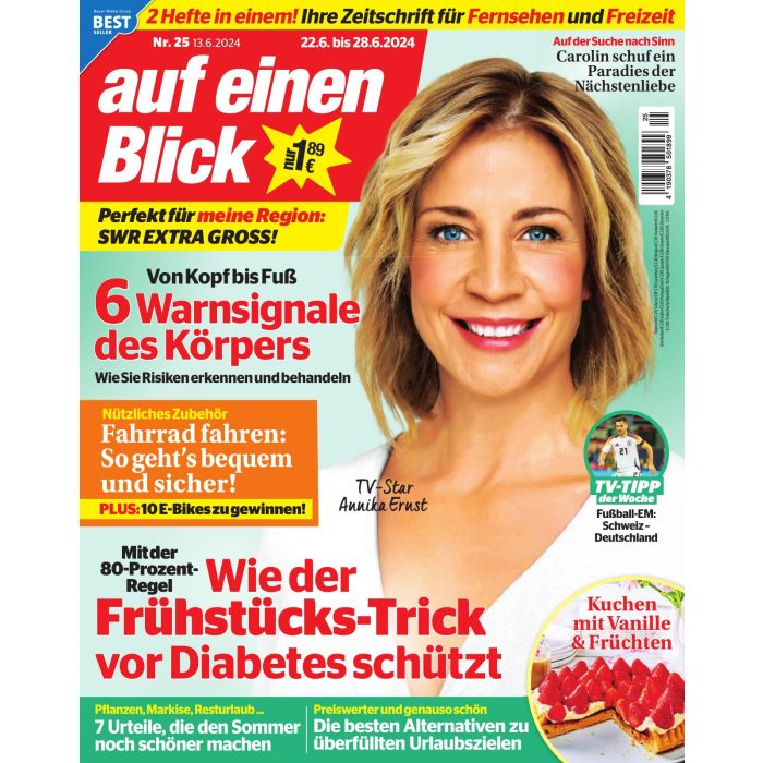 Die Auf einen Blick ist eine wöchentlich erscheinende Programmzeitschrift, die neben einem umfangreichen Programmüberblick aller größeren Fernsehsender, auch zahlreiche Reportagen rund um Prominente sowie Tipps und Tricks für das Alltagsleben bietet. Die Zeitschrift orientiert sich an den Interessensgebieten von Frauen der mittleren Generation und bietet praktische Einblicke und Informationen rund um Themen wie Kinder, Reisen, Beruf und Gesundheit.