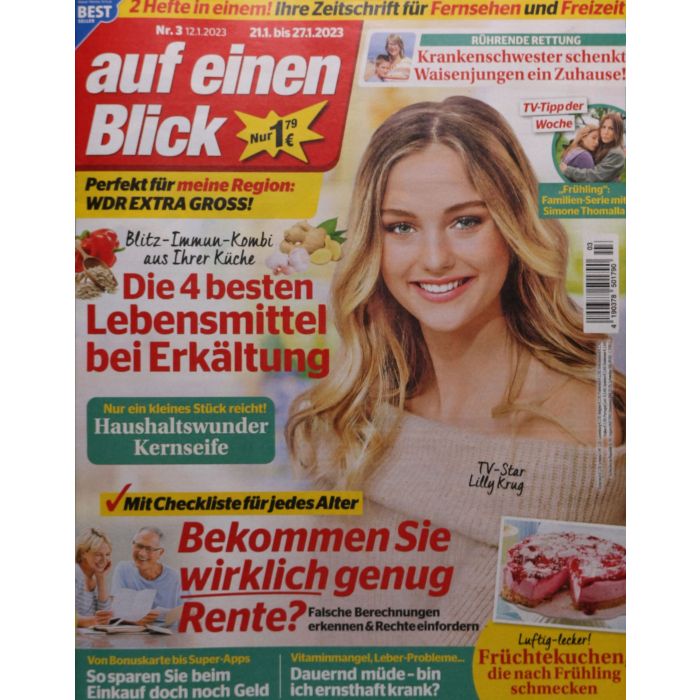 Die Auf einen Blick ist eine wöchentlich erscheinende Programmzeitschrift, die neben einem umfangreichen Programmüberblick aller größeren Fernsehsender, auch zahlreiche Reportagen rund um Prominente sowie Tipps und Tricks für das Alltagsleben bietet. Die Zeitschrift orientiert sich an den Interessensgebieten von Frauen der mittleren Generation und bietet praktische Einblicke und Informationen rund um Themen wie Kinder, Reisen, Beruf und Gesundheit.