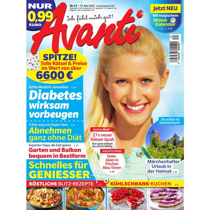 Das wöchentlich erscheinende Magazin Avanti ist die richtige Wahl für alle Frauen ab 30, die aktuelle Trends aus Mode und Freizeit mit einem vielseitigen Rätselspaß verbinden möchten. Vom klassischen Kreuzworträtsel über Sudokus bis zu kleinen Denkaufgaben für Zwischendurch stellt das Magazin auf zahlreichen Seiten eine Herausforderung für die grauen Zellen dar. Bei vielen Rätseln bietet die Zeitschrift Gewinnchancen auf Bargeld, Reisen oder Unterhaltungselektronik.