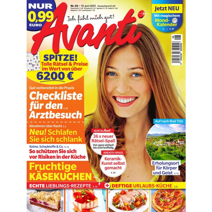 Das wöchentlich erscheinende Magazin Avanti ist die richtige Wahl für alle Frauen ab 30, die aktuelle Trends aus Mode und Freizeit mit einem vielseitigen Rätselspaß verbinden möchten. Vom klassischen Kreuzworträtsel über Sudokus bis zu kleinen Denkaufgaben für Zwischendurch stellt das Magazin auf zahlreichen Seiten eine Herausforderung für die grauen Zellen dar. Bei vielen Rätseln bietet die Zeitschrift Gewinnchancen auf Bargeld, Reisen oder Unterhaltungselektronik.