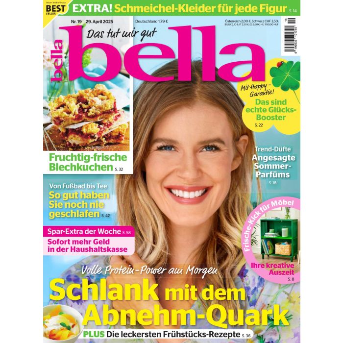 Das Wochenmagazin bella ist eine Frauenzeitschrift mit Schwerpunkten in den Bereichen Beauty, Gesundheit und genussvollem Essen. Das Magazin richtet sich an Frauen im mittleren Lebensalter, die ihr Leben genießen und durch außergewöhnliche Rezepte, Kosmetiktipps oder reizvolle Ausflugsziele immer wieder neue Impulse erhalten möchten.