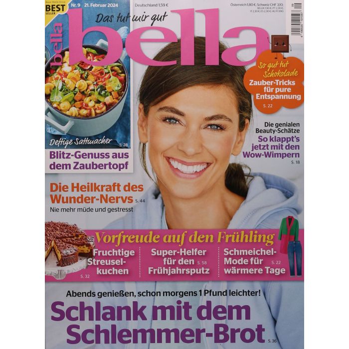Das Wochenmagazin bella ist eine Frauenzeitschrift mit Schwerpunkten in den Bereichen Beauty, Gesundheit und genussvollem Essen. Das Magazin richtet sich an Frauen im mittleren Lebensalter, die ihr Leben genießen und durch außergewöhnliche Rezepte, Kosmetiktipps oder reizvolle Ausflugsziele immer wieder neue Impulse erhalten möchten.