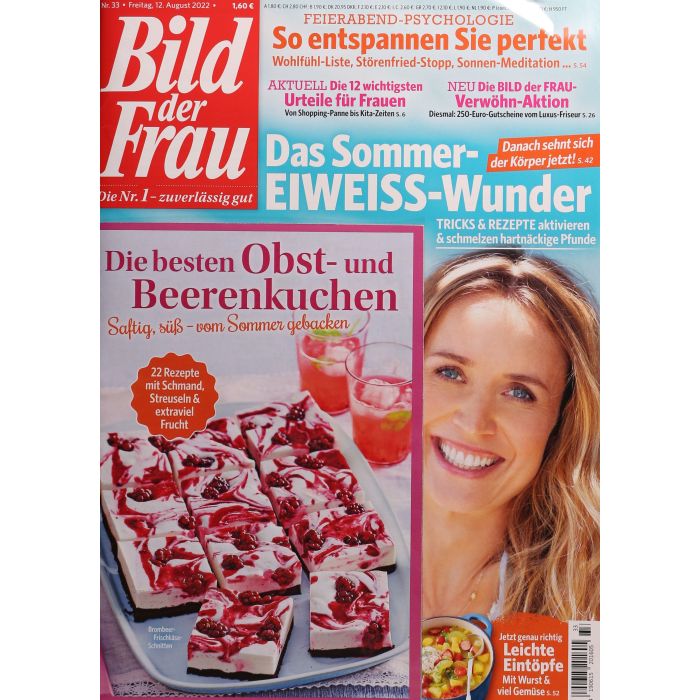 Erfahren sie mit BILD der FRAU alles rund um Themen wie Kochen, Backen, Ernährung, Diäten, Gesundheit, MODE, Schönheit, Unterhaltung und viele weitere spannende und abwechslungsreiche Themen. Das beliebte Magazin BILD der FRAU erscheint wöchentlich jeden Freitag. Das Magazin ist unterteilt IN folgenden Rubriken: Aktuelles & Schicksale, Reise & Freizeit, MODE & Schönheit, Stars & Partys, Ernährung und Gesundheit, Psychologie und Lebenshilfe, Ratgeber & Ideen und beinhaltet exklusive Porträts, Reportagen oder Interviews.