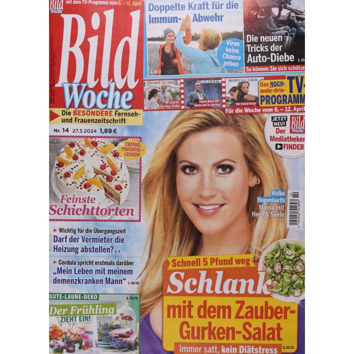 Bild Woche- Das Fernsehmagazin und die IllustrierteTV-Programm und TV-Highlights werden auf vielen Seiten präsentiert. Jedoch nicht nur das aktuelle Fernsehprogramm gehört in den Inhalt, auch ein informativer Ratgeberteil mit vielen tollen Tipps für den Alltag kommen dazu.Interviews und Geschichten von Stars und Sternchen oder auch Rätselseiten gehören auf den vielen Seiten genauso dazu. Das optimale Magazin für die Frau, die auch gerne mal neue Rezepte ausprobiert oder tolle Do-it-yourself Produkte herstellt.Das wöchentlich erscheinende TV-Magazin für Ihre Freizeit.