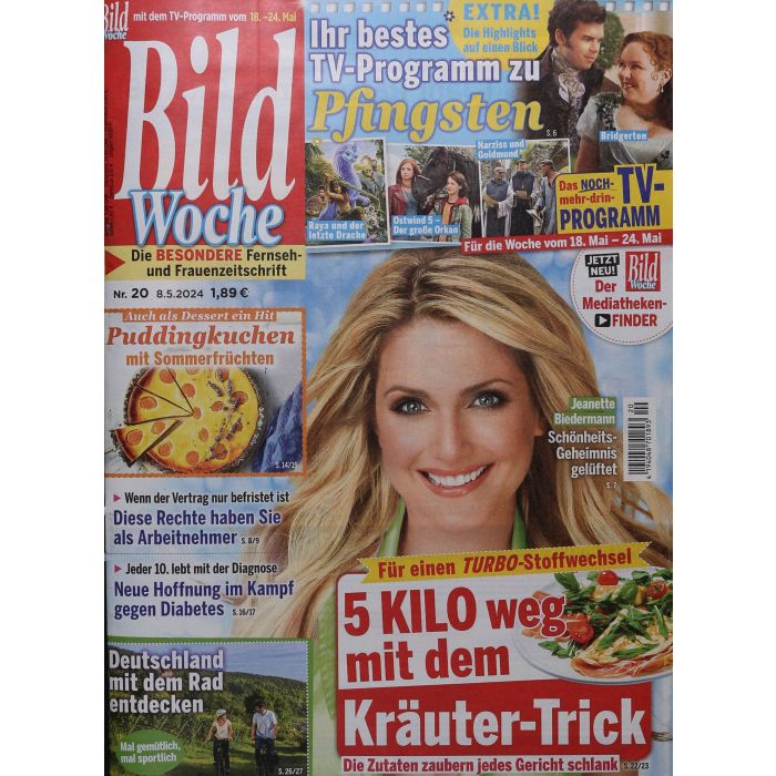 Bild Woche- Das Fernsehmagazin und die IllustrierteTV-Programm und TV-Highlights werden auf vielen Seiten präsentiert. Jedoch nicht nur das aktuelle Fernsehprogramm gehört in den Inhalt, auch ein informativer Ratgeberteil mit vielen tollen Tipps für den Alltag kommen dazu.Interviews und Geschichten von Stars und Sternchen oder auch Rätselseiten gehören auf den vielen Seiten genauso dazu. Das optimale Magazin für die Frau, die auch gerne mal neue Rezepte ausprobiert oder tolle Do-it-yourself Produkte herstellt.Das wöchentlich erscheinende TV-Magazin für Ihre Freizeit.