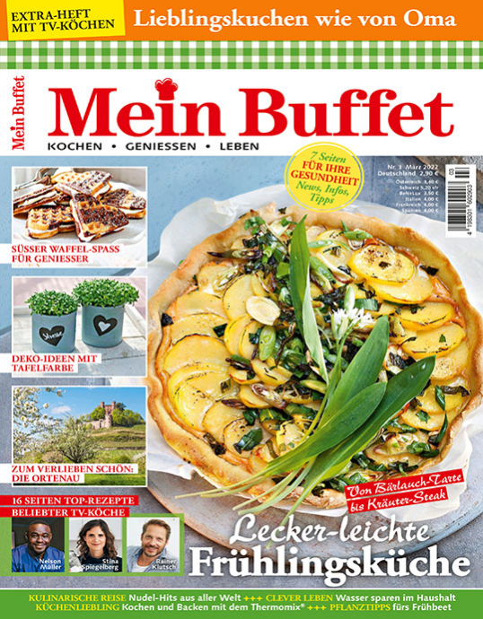 Mein Buffet serviert Ihnen kreative Rezeptideen aus frischen und saisonalen Zutaten zum Nachkochen und Probieren. Ob herzhaft oder süß, ob für Anfänger oder ambitionierte Hobbyköche: Hier findet jeder sein Lieblingsrezept – und seinen Lieblingskoch!