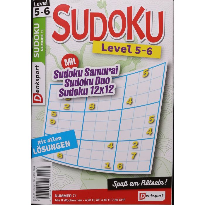 „Sudoku Level 5-6“ sorgt für Abwechslung! Neben klassischen Sudokus mit den Schwierigkeiten Level 5, Level 5-6 und Level 6 finden Sie hier auch die spannenden Varianten Sudoku Samurai, Sudoku Duo und Sudoku 12x12.