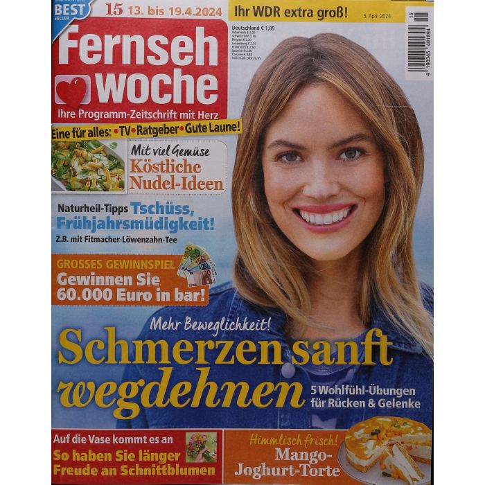 Familienfreundliche Fernsehzeitschrift für die ganze Woche Die Fernsehwoche ist eine umfassende, wöchentliche Programmzeitschrift für die ganze Familie. Das aktuelle und ausführliche Fernsehprogramm wird durch eine vielseitige Themenwelt ergänzt. Spannende Reportagen und nützliche Tipps zu Alltagsthemen wie Geldanlagen, Haushalt, Beauty, Wellness und Genuss stehen im Fokus. Als besonderes Highlight werden jede Woche in einem speziellen Gesundheitsteil wichtige Fortschritte der Medizin verbrauchernah präsentiert. Zusätzlich unterhalten vielfältige Rätsel mit tollen Preisen die Leserschaft. Herstellerinformationen: Heinrich Bauer Verlag KG Burchardstraße 11, 20077 Hamburg E-Mail/URL: www.bauermedia.com