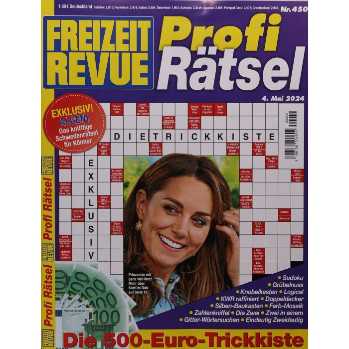 FREIZEIT REVUE Profi Rätsel – Das Heft bietet ausschließlich Knobelrätsel für echte Profis. Jeden Monat können sich Rätselexperten der Herausforderung auf 44 Seiten stellen: von A wie Achterbahn bis Z wie Zweideutig Eindeutig, Logical, Knobelkasten, Sudoku und exklusiv „Die 500-Euro-Trickkiste“ ist alles mit dabei. Hier kommt der Rätselspaß nicht zu kurz, denn die Standorte für die Lösungswörter im Diagramm müssen selbst herausgefunden werden.