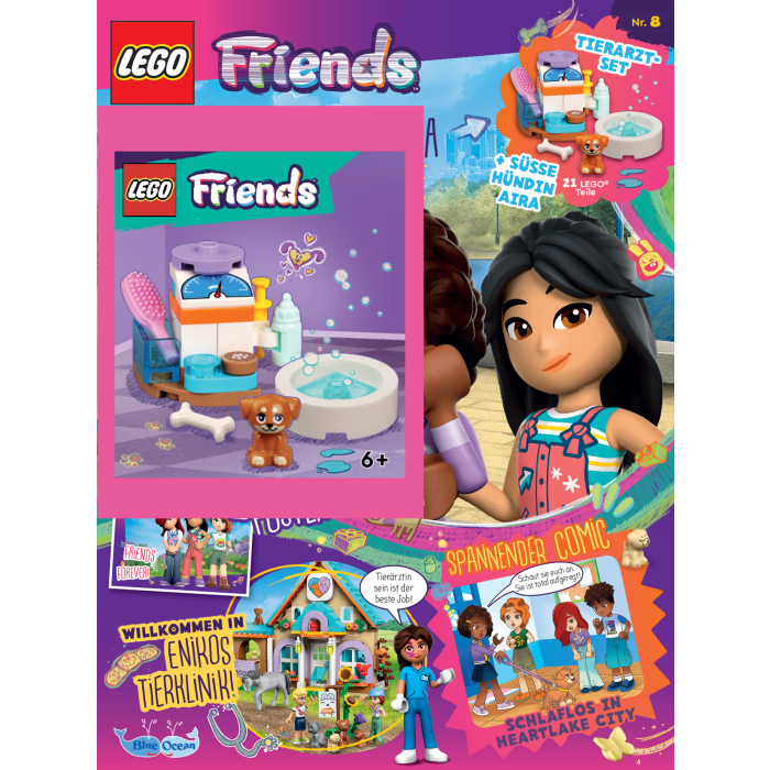 Das LEGO Friends Magazin lädt Kinder ab 6 Jahren in Enikos Tierklinik ein. Mit dem beiliegenden Tierarzt-Set und der süßen Hündin Aira können liebevolle Pflegeszenen nachgespielt werden. Das Set enthält 21 Teile, darunter Zubehör wie Bürste, Napf und Knochen. Ergänzt wird das Magazin durch einen spannenden Comic und eine Geschichte aus Heartlake City, die zum Mitfühlen und Mitspielen einlädt. Ein ideales Geschenk für kleine Tierfreunde mit großer Fantasie.