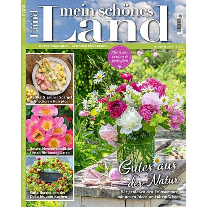 Die Ausgabe 3/2025 von „Mein schönes Land“ lädt dazu ein, den Frühsommer mit allen Sinnen zu erleben. Mit dem Themenschwerpunkt „Gutes aus der Natur“ vereint das Magazin traditionelles Wissen, saisonale Rezepte, bienenfreundliche Gartentipps und kreative Dekoideen rund um Blüten und Kräuter. Ideal für alle, die das ländliche Lebensgefühl lieben und Inspiration für Küche, Garten und Zuhause suchen.