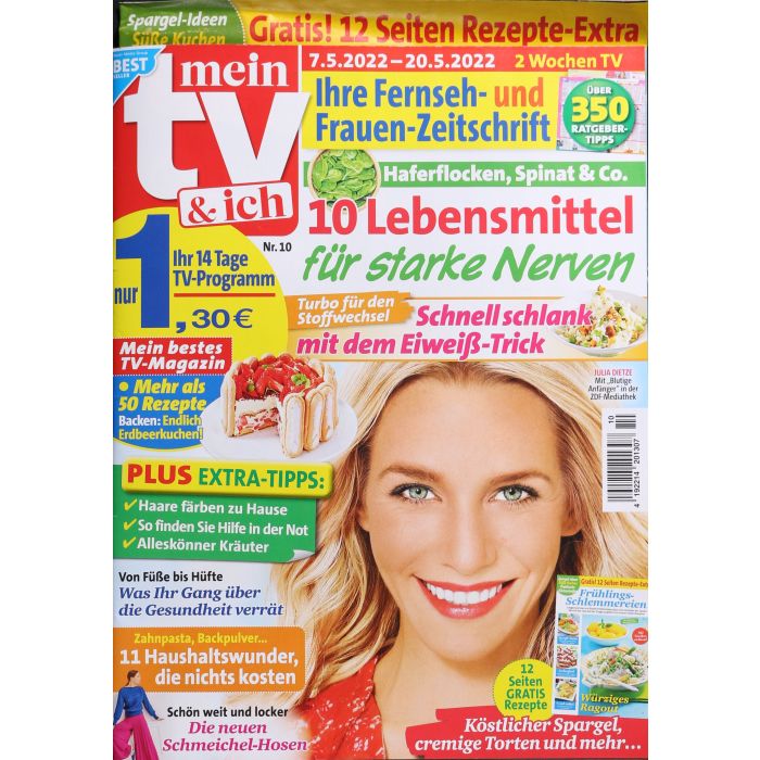 Eine gelungene Kombination aus Fernsehmagazin und leichter Frauenzeitschrift bietet sich mit Mein tv & ich vor allem jungen und junggebliebenen Frauen für die zweiwöchentliche Lektüre. Neben einem umfangreichen und übersichtlichen Fernsehprogramm für alle Programme zeigen sich IN dieser Zeitschrift Rezepte und Dekorationstipps, Ratgeber zu Ernährung, Gesundheit und Medizin, aber auch humorvolle Berichte sowie amüsante und einfühlsame Kurzreportagen für den entspannten Feierabend.