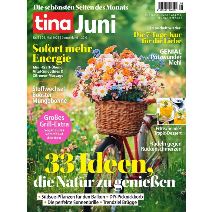 Die Tina Monthly 6/2025 begleitet Sie durch den Juni mit einer inspirierenden Mischung aus Lifestyle, Mode, Beauty, Gesundheit und sommerlichen Rezeptideen.
