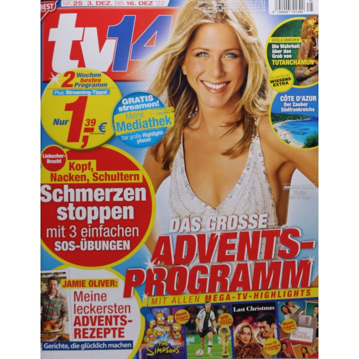 tv 14 - vielseitige Illustrierte mit großem ProgrammteilDie tv 14 wird seit 1999 angeboten und gehört zu den etabliertesten Fernsehzeitschriften im deutschsprachigen Raum. Schwerpunkt des Magazins ist die ausführliche Präsentation des Fernsehprogramms für die folgenden 14 Tage, wobei jeden Tag auf besondere Highlights wie Hollywoodfilme, Serienstarts oder Dokumentationen hingewiesen wird.Ergänzt wird das Magazin um informative Artikel aus der Welt der Stars sowie verschiedene Servicerubriken wie Recht, Gesundheit oder Finanzen. Sie richtet sich an sämtliche Altersgruppen und beiderlei Geschlecht, um jedem Leser einen Überblick über das aktuelle Fernsehprogramm zu verschaffen. Herstellerinformationen: Heinrich Bauer Verlag KG Burchardstraße 11, 20077 Hamburg E-Mail/URL: www.bauermedia.com