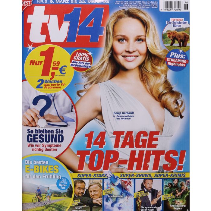 tv 14 - vielseitige Illustrierte mit großem ProgrammteilDie tv 14 wird seit 1999 angeboten und gehört zu den etabliertesten Fernsehzeitschriften im deutschsprachigen Raum. Schwerpunkt des Magazins ist die ausführliche Präsentation des Fernsehprogramms für die folgenden 14 Tage, wobei jeden Tag auf besondere Highlights wie Hollywoodfilme, Serienstarts oder Dokumentationen hingewiesen wird.Ergänzt wird das Magazin um informative Artikel aus der Welt der Stars sowie verschiedene Servicerubriken wie Recht, Gesundheit oder Finanzen. Sie richtet sich an sämtliche Altersgruppen und beiderlei Geschlecht, um jedem Leser einen Überblick über das aktuelle Fernsehprogramm zu verschaffen. Herstellerinformationen: Heinrich Bauer Verlag KG Burchardstraße 11, 20077 Hamburg E-Mail/URL: www.bauermedia.com