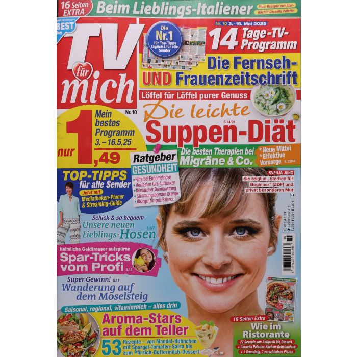 Sie enthält eine gute Mischung aus den wichtigsten Alltagsthemen wie Mode, Gesundheit oder aber auch Kochen und Backen. TV FÜR MICH berät Sie in den kleinen und großen Fragen des Alltags oder begleitet Sie in Ihrer Freizeit.