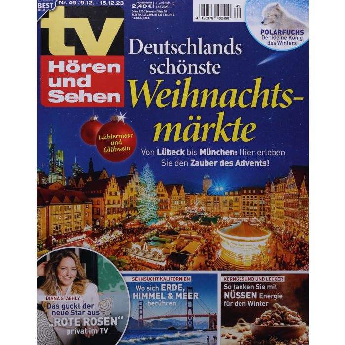 Die Leserinnen und Leser erfahren in der TV Hören und Sehen welche spannenden Filme und Dokumentationen in der nächsten Woche im Fernsehen ausgestrahlt werden!TV Hören und Sehen ist eine wöchentliche Programmzeitschrift, die zusätzlich informative Berichte und Faszinierende Fotos über verschiedene Themen wie Gesundheit, Reisen oder Natur enthält.
