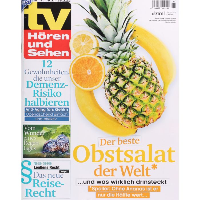 Die Leserinnen und Leser erfahren in der TV Hören und Sehen welche spannenden Filme und Dokumentationen in der nächsten Woche im Fernsehen ausgestrahlt werden!TV Hören und Sehen ist eine wöchentliche Programmzeitschrift, die zusätzlich informative Berichte und Faszinierende Fotos über verschiedene Themen wie Gesundheit, Reisen oder Natur enthält.