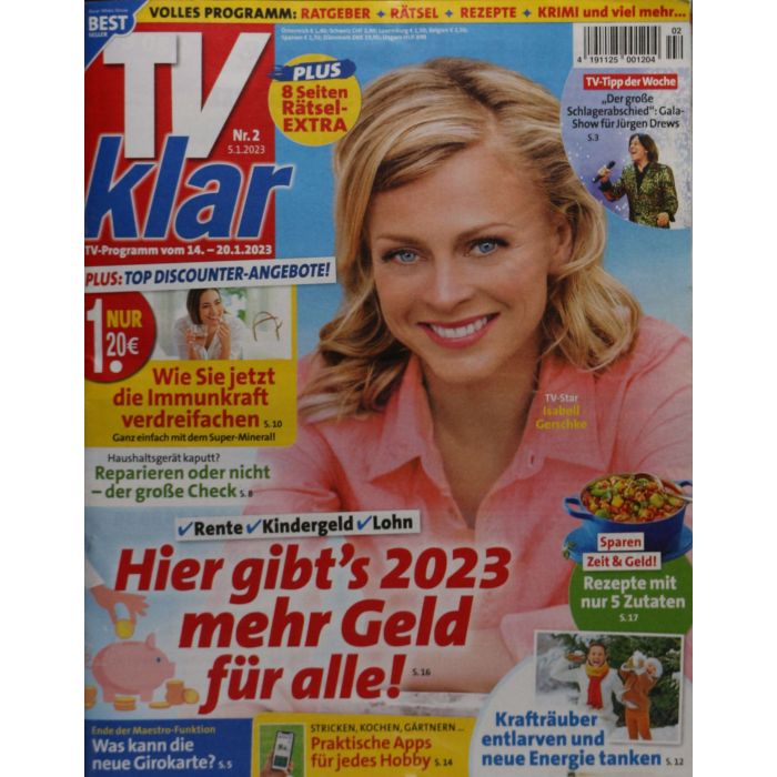 TV klar bietet seinen Leserinnen und Lesern viele ergänzende Informationen IN zahlreichen Servicerubriken. Ratgeber aus den Bereichen Haushalt, MODE, Familie oder Recht stehen ebenso bereit wie verschiedene Gewinnspiele und Rätsel, die Bargeld, Reisen oder Geräte der Unterhaltungselektronik IN Aussicht stellen.