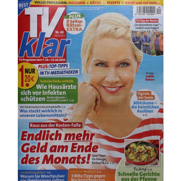 TV klar bietet seinen Leserinnen und Lesern viele ergänzende Informationen IN zahlreichen Servicerubriken. Ratgeber aus den Bereichen Haushalt, MODE, Familie oder Recht stehen ebenso bereit wie verschiedene Gewinnspiele und Rätsel, die Bargeld, Reisen oder Geräte der Unterhaltungselektronik IN Aussicht stellen.