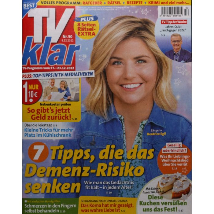 TV klar bietet seinen Leserinnen und Lesern viele ergänzende Informationen IN zahlreichen Servicerubriken. Ratgeber aus den Bereichen Haushalt, MODE, Familie oder Recht stehen ebenso bereit wie verschiedene Gewinnspiele und Rätsel, die Bargeld, Reisen oder Geräte der Unterhaltungselektronik IN Aussicht stellen.
