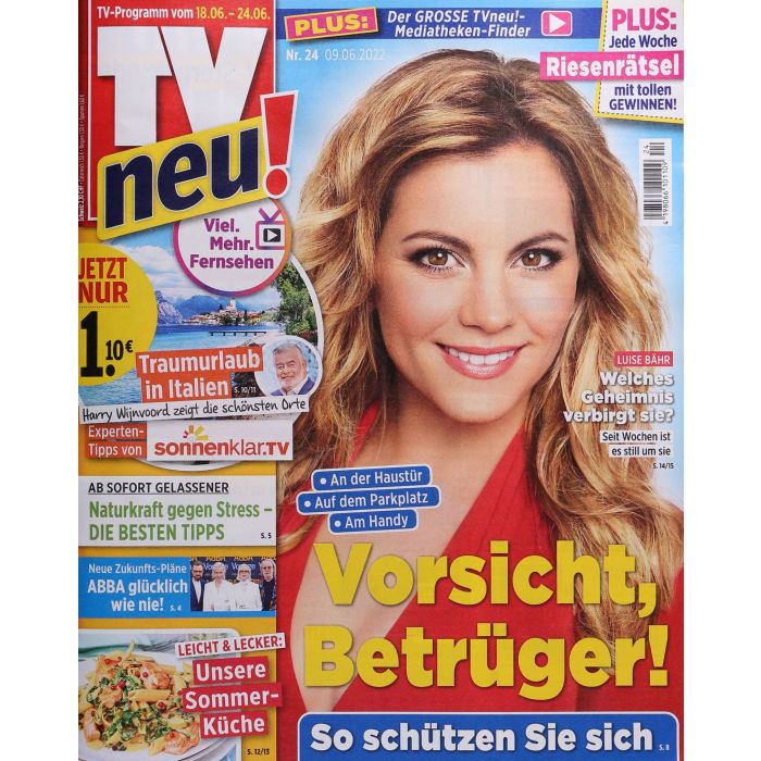 Die junge Fernsehzeitschrift – TV neu! Alle Höhepunkte ausgehend von Spielfilmen, Serien, Dokumentationen und Shows werden in übersichtlicher Weise auf den ersten Seiten kompakt dargestellt. In einer Übersicht sehen Sie das aktuelle TV-Programm der Woche. Damit verpassen Sie keine Ihrer Lieblingssendungen mehr. Zum aktuellen des TV-Programms kommen noch tolle Berichte aus und für den Alltag hinzu. Spannende Themen wie Reisen, Gesundheit, Kochen und persönliche Geschichten werden auf vielen Seiten mit schönen Fotos und informativen Texten hinterlegt. Für einen kleinen Preis hat die Zeitschrift viel zu bieten und ist eine ideale Freizeitbeschäftigung. Herstellerinformationen: Medienholding Klambt GmbH & Co. KG Im Neudeck 1 , 67346 Speyer E-Mail/URL: info@klambt.de