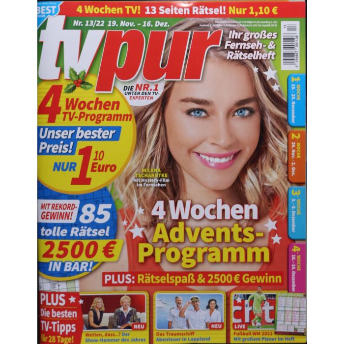 Als moderne Zeitschrift für das Fernsehprogramm liegt der Inhaltsschwerpunkt der Zeitschrift tvpur auf größtem Fernsehspaß. Neben einigen weiteren Inhalten in Form von Rätseln und kleineren Humoreinlagen wendet sich die Zeitschrift mit dem umfangreichen Fernsehprogramm auf vier Seiten pro Tag vor allem an junge und aktive Menschen, die ihren Informationsfluss selektiv lenken - auch in Bezug auf den Fernsehkonsum.