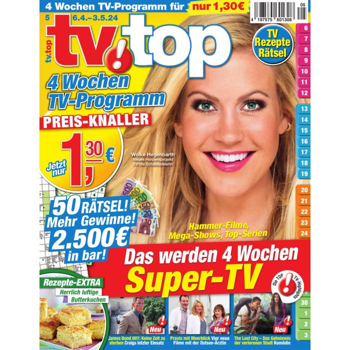 tv!top: Das junge Fernsehmagazin mit vierwöchigem Programmangebottv!top ist eine vierwöchentlich erscheinende Zeitschrift, die sich an Frauen und Männer im mittleren Lebensalter richtet und diesen einen umfassenden Einblick über vier Wochen Fernsehprogramm bietet. Auf 132 Seiten bietet die Zeitschrift neben einem ausführlichen Einblick IN anstehende TV-Highlights spannende Artikel und Reportagen aus der Welt der Schauspieler ebenso wie aus dem Alltagsleben der Leserschaft.Trotz der umfangreichen Seitenzahl präsentiert sich das Heft IN einem kompakten FORMAT, das neben seinen vielfältigen Inhalten, Informationen und Trends auch durch seine Form überzeugt.
