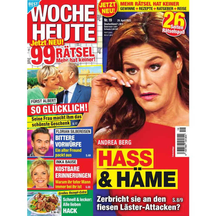 Die Woche Heute ist eine Zeitschrift für Frauen IN der Mitte des Lebens, die von einem wöchentlichen Magazin gleichermaßen unterhalten und informiert werden möchten. Einblicke IN das Leben der Prominenten werden ebenso geboten wie Reisereportagen, köstliche Rezepte sowie viele praktische Tipps für den Alltag.