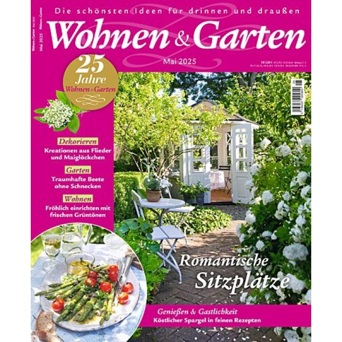 Die Mai-Ausgabe 2025 der beliebten Zeitschrift Wohnen & Garten lädt dich ein, den Frühling mit allen Sinnen zu genießen. Mit dem Titelthema „Romantische Sitzplätze“ und liebevollen Ideen für fröhliche Einrichtung mit Grüntönen, schneckenfreie Traumbeete, florale Arrangements mit Flieder und Maiglöckchen sowie Spargelgerichte für Genießer bietet diese Ausgabe eine stilvolle Mischung aus Natur, Genuss und klassischem Landhausstil.